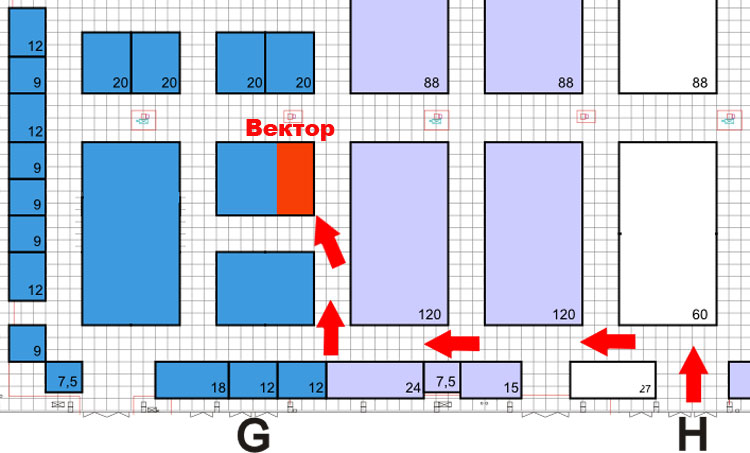 * На фрагменте схемы павильона стенд компании "Вектор" Киев отмечен красным цветом, а так же стрелками показан проход к стенду от входа Н в данный павильон. |