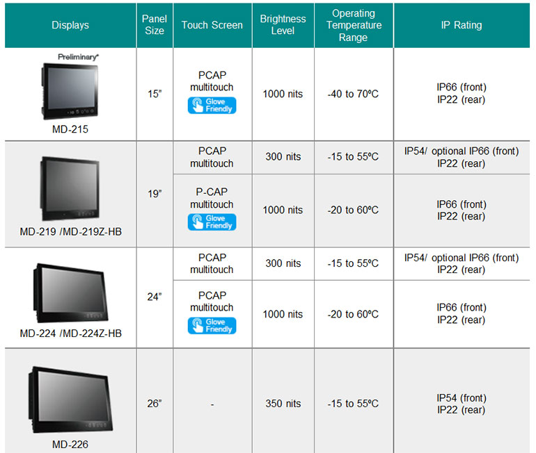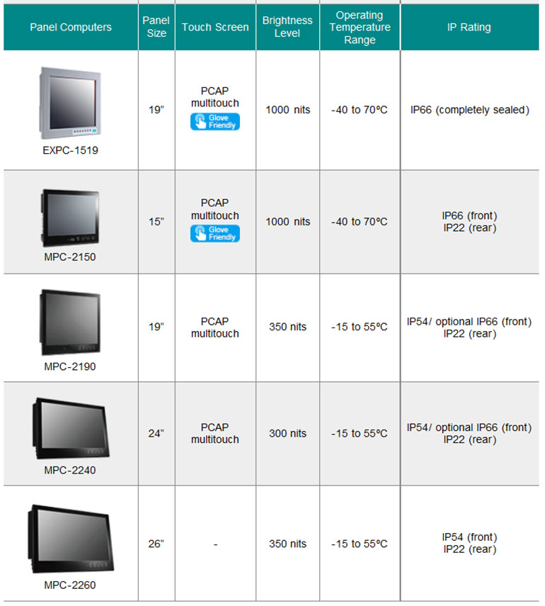 панельные компьютеры обладают специальными свойствами, важными для критических приложений, такими как широкий диапазон рабочих температур, компактный безвентиляторный дизайн и IP66-сертифицированное исполнение для обеспечения длительного срока эксплуатации и надежности в экстремальных условиях окружающей среды. Кроме того, пользователям больше не нужно снимать перчатки (в жестких промышленных условиях эксплуатации) при работе на экранах компьютеров благодаря glove-friendly ("перчаточно"-дружественной) технологии мультитач. Для выполнения требований различных промышленных применений, Moxa предлагает как 300-нит (стандартная конфигурация) так и 1000-нит (высокая яркость) дисплейные панели, что позволяет пользователям качественно просматривать содержимое в любых условиях освещения.