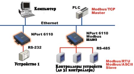протокол Modbus/TCP. В этом случае, шлюз NPort 6110