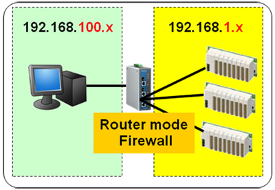 настроек индустриальной системы управления для использования двух подсетей с целью удовлетворения требований режима “router mode” брандмауэра.