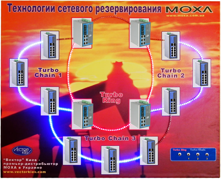 На стенде также будет представлен действующий макет, объясняющий принципы технологий сетевого резервирования, поддерживаемого Ethernet коммутаторами MOXA.
