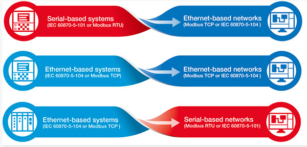преобразование протоколов Modbus RTU / ASCII / TCP, IEC 60870-5-101 и IEC 60870-5-104, помогая пользователям устанавливать связь между устаревшими и модернизированными системами в приложениях энергетики.