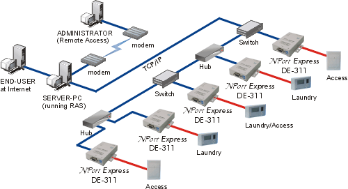 конкретной реализации используется шесть NPort Express, которые обеспечивают контроль 4 прачечных и 3 устройств контроля доступа. В настоящий момент в системе используются коммутаторы и хабы, но в скором времени они будут заменены на
