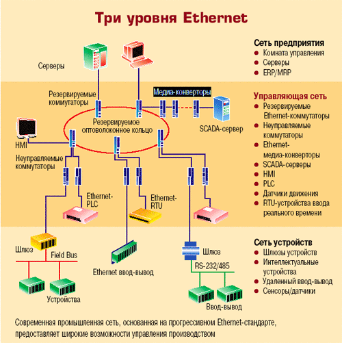 - собственно управляющая производственным процессом сеть. Основу ее чаще всего составляет резервируемое оптоволоконное и электрическое Ethernet-кольцо. Это наиболее