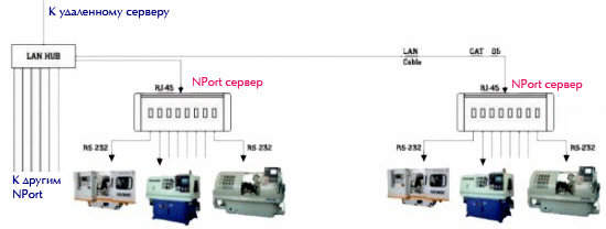 устройства соединяются с серверами серии NPort с использованием RS-232 кабелей через