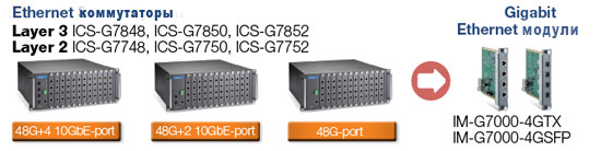 Серия Moxa IM-G7000 включает в себя модули IM-G7000-4GTX и IM-G7000-4GSFP с возможностью горячей замены Gigabit Ethernet интерфейсных модулей для Layer 3 индустриальных коммутаторов серии МОХА ICS-G7848 / G7850 / G7852 и Layer 2 коммутаторов серии ICS-G7748 / G7750 / G7752. С помощью этих гибких интерфейсных модулей, модульные Ethernet коммутаторы серии ICS могут обеспечить до 48 Gigabit Ethernet портов с медным или SFP волоконно-оптическими соединителями.