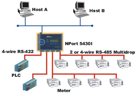 4-портовые асинхронные сервера RS-232 или RS-422/485 в Ethernet