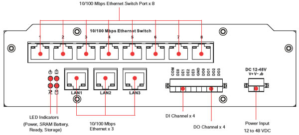 Серия UC-8416 Индустриальный RISC компьютер с 8 serial портами, 3 LAN, 4 DIO, 8 портовый Ethernet коммутатор, CompactFlash, USB