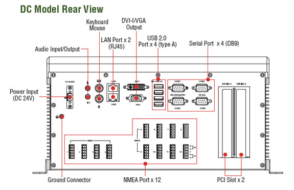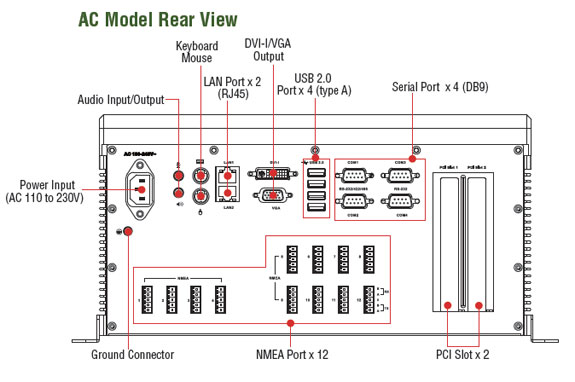 4 serial порта, 2 PCI слота, 2 Gigabit Ethernet порта, 6 USB портов, 12 NMEA портов,