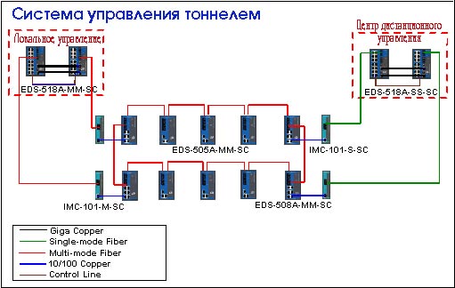 Применение Применение EDS-508A/505A в системе мониторинга тоннелей Основная особенность системы мониторинга - ее территориальная распределенность, т.к. тоннели могут достигать до 20 км длины. Используемое в системе мониторинга различное оборудование должно было быть объединено в единую сеть. Эту задачу разработчики системы управления решили с использование оборудования МОХА EDS-508A/505A и медиаконверторов IMC-101-MM-SC. Для работы с оборудование, распределенным по тоннелю были выбраны МОХА EDS-508A/505A коммутаторы с необходимым числом Ethernet портов и оптическими портами для организации сетевой структуры. Конверторы IMC-101-MM-SC связывают центр управления и сеть мониторинга. ![]() Выбор
