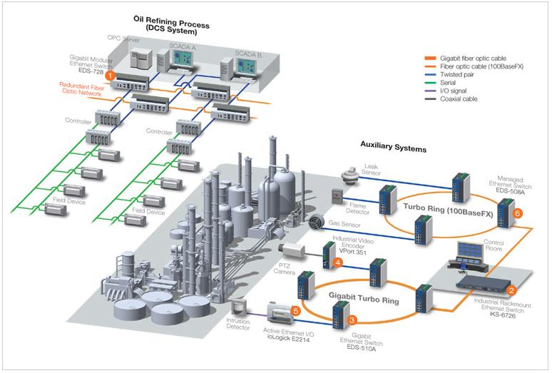 Централизованная проверка и управление большим числом оборудования по индустриальной Ethernet сети с использованием оптоволокна, является необходимостью для нефтеперерабатывающих предприятий большого размера. Многочисленные волоконные кольца формируют единую сеть управления устройствами, расположенными на большой территории (сенсоры, детекторы и т.п.) для передачи информации в управляющую SCADA систему. Видеонаблюдение по IP и решения Ethernet ввода/вывода также интегрированы в эту сеть для проверки и управления в реальном времени (например, состояния окружающей среды нефтеперегонных заводов, утечки газов и т.п.) и быстрого реагирования на непредвиденнее ситуации.